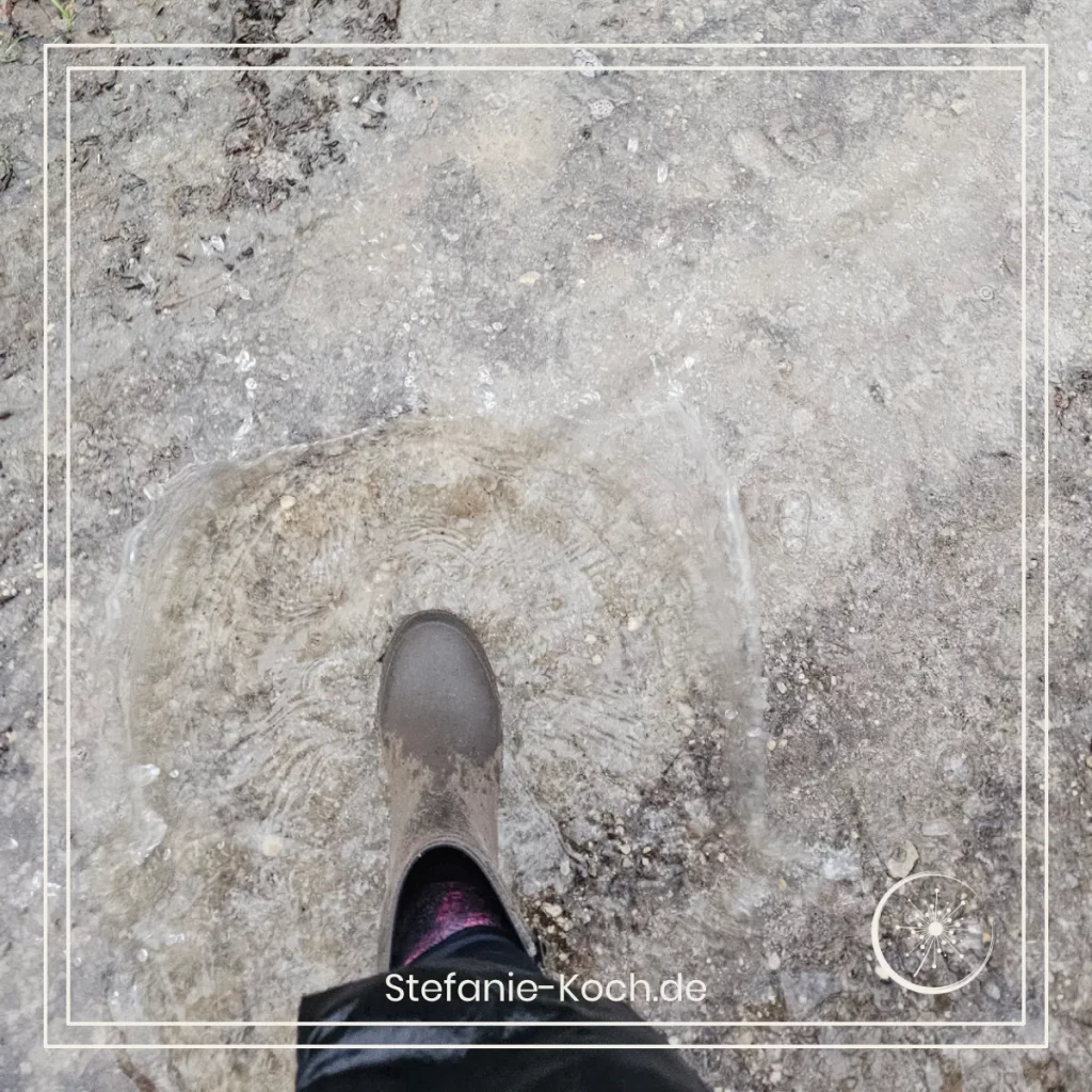 Daher habe ich das trübe Tau- und Gummistiefelwetter genutzt um eine Kindheitserinnerung zu beleben. Ich habe in meinen Gummistiefeln Anlauf genommen und bin mit einem großen Carl-Lewis-Satz in die nächste Pfütze gesprungen – es hat super gespritzt. Beweisphotos gibt es nur in meiner Erinnerung. Ben kann nicht gut mit dem Handy umgehen und den richtigen Selfie-Moment bei einem Megasatz zu erwischen ist olympische Höchstleistung. Deshalb gibt es „nur“ einen kleinen Pfützenspritzer als Erinnerung im Online-Tagebuch.