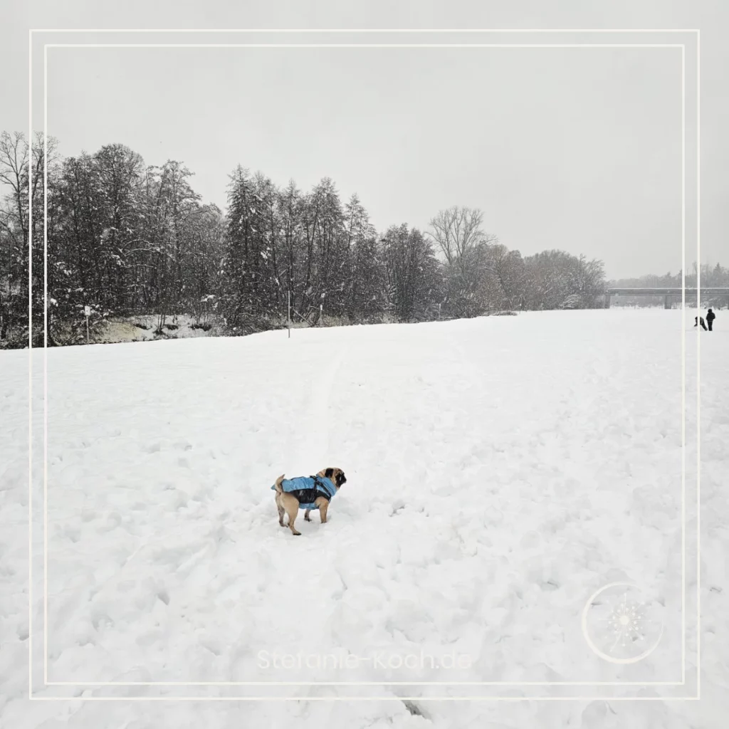 Heute ist ein traumhaftschöner Tag – Schnee in der Nacht, -10 Grad auf dem Thermometer, strahlend blauer Himmel und richtig gute Luft. Die Hunderunden haben eigentlich Spaß gemacht. Wenn da nicht der blöde Splitt auf den Gehwegen wäre. Ben stakst wie eine Diva auf 12 cm High Heels über die Bürgersteige und lässt sich gefühlt alle 10 Meter die Vorderpfoten reinigen.